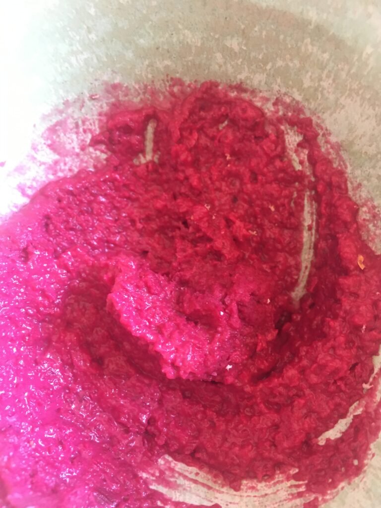 Finely grate a beet root and stir into the hummus. It should turn beautifully pink. If not, you’ll need more beet root:). Once you got the color right, grate some orange zest and add a little. Try it. More zest?