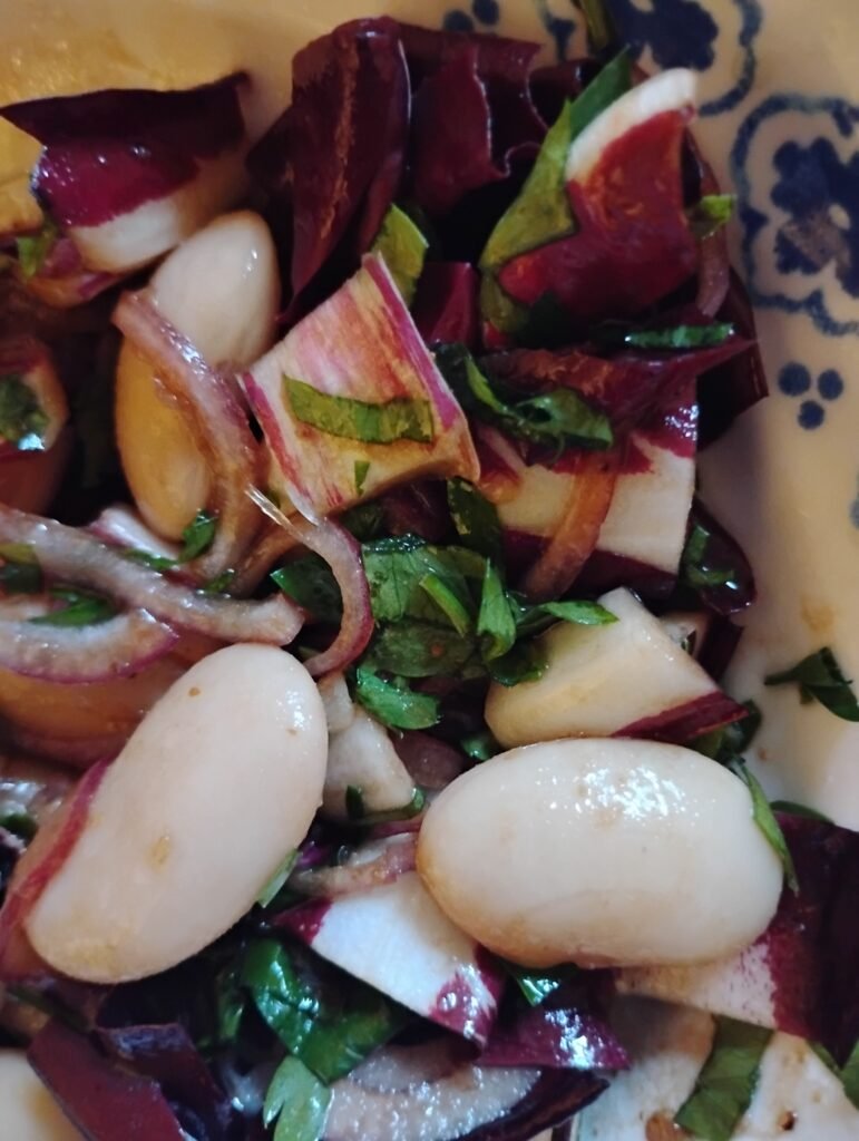 Die weichen, cremigen Bohnen harmonieren gut mit dem bitteren Radicchio und machen für diejenigen, die das Bittere nicht so sehr schätzen, den Geschmack angenehmer.